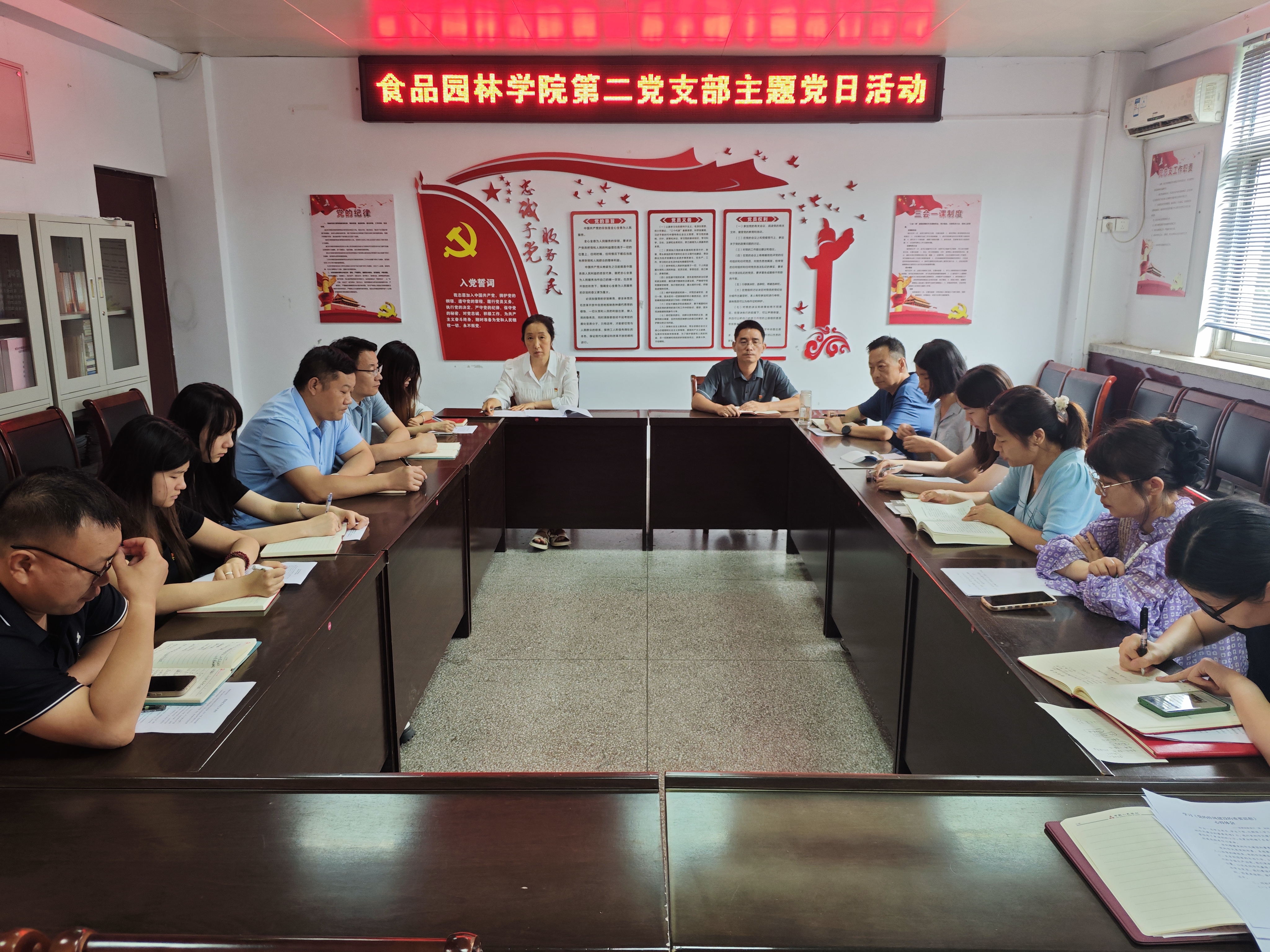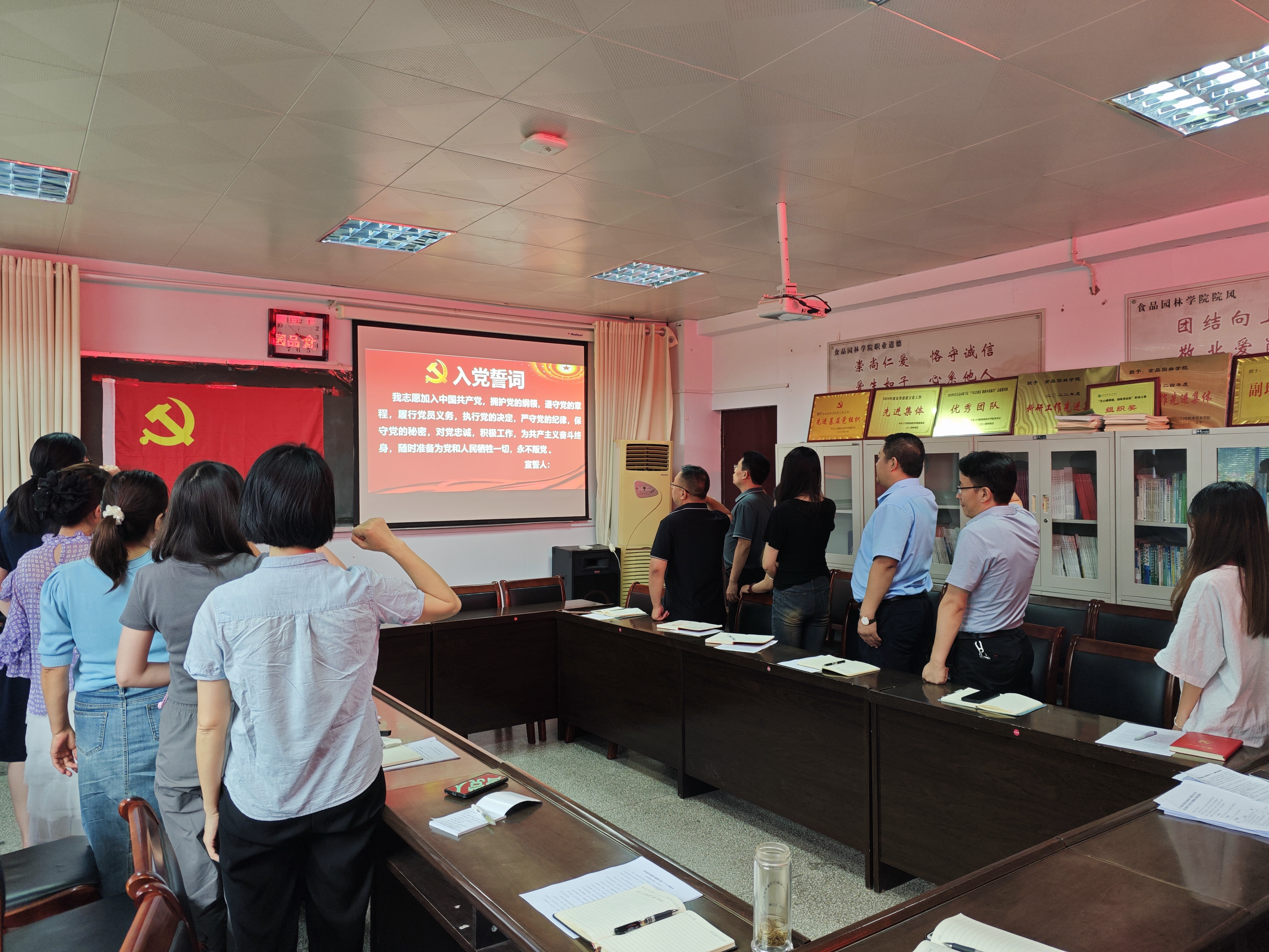 会议第五项为重温入党誓词。全体党员列队面向党旗,由党总支副书记辛峰同志领誓,党员们高举右拳,庄严宣誓。在铮铮誓言中,党员们重温了入党时的初心与使命,进一步坚定了理想信念,增强了党员意识和党性观念。