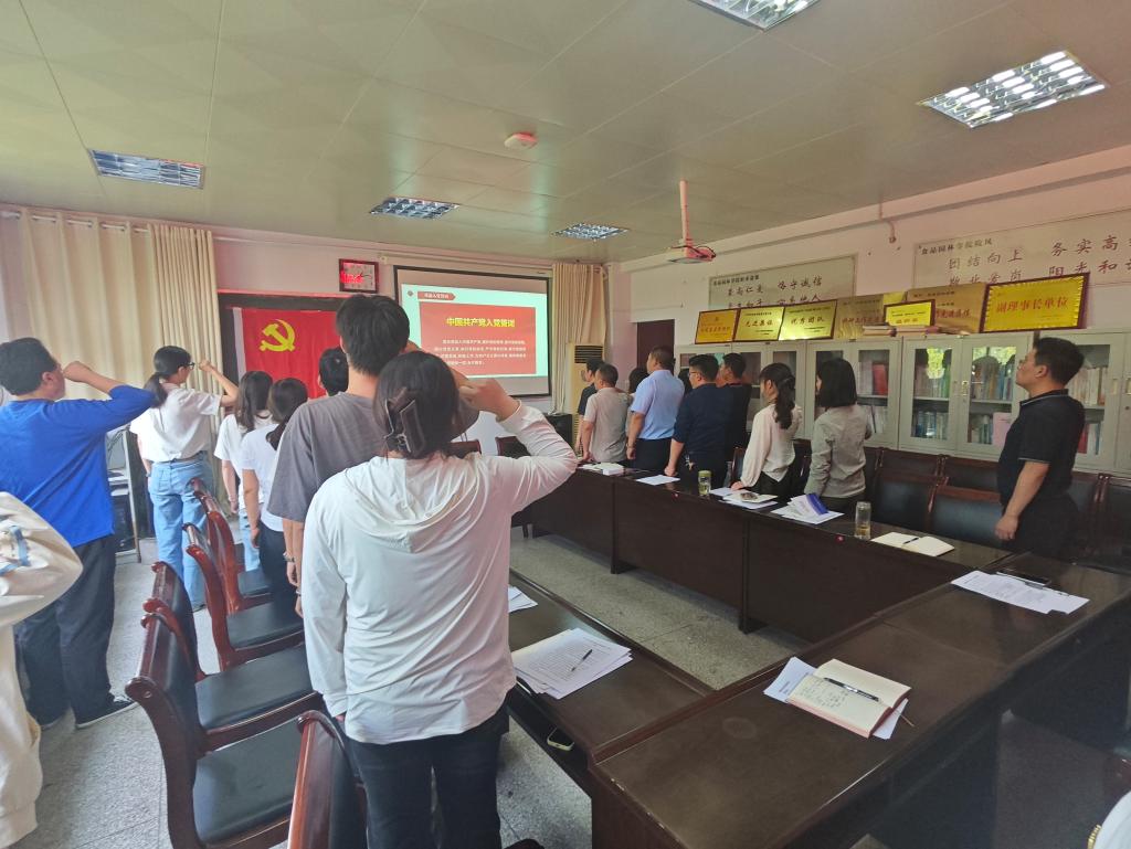 会议第四项为重温入党誓词。全体党员列队面向党旗,由党总支副书记辛峰同志领誓,党员们高举右拳,庄严宣誓。在铮铮誓言中,党员们重温了入党时的初心与使命,进一步坚定了理想信念,增强了党员意识和党性观念。