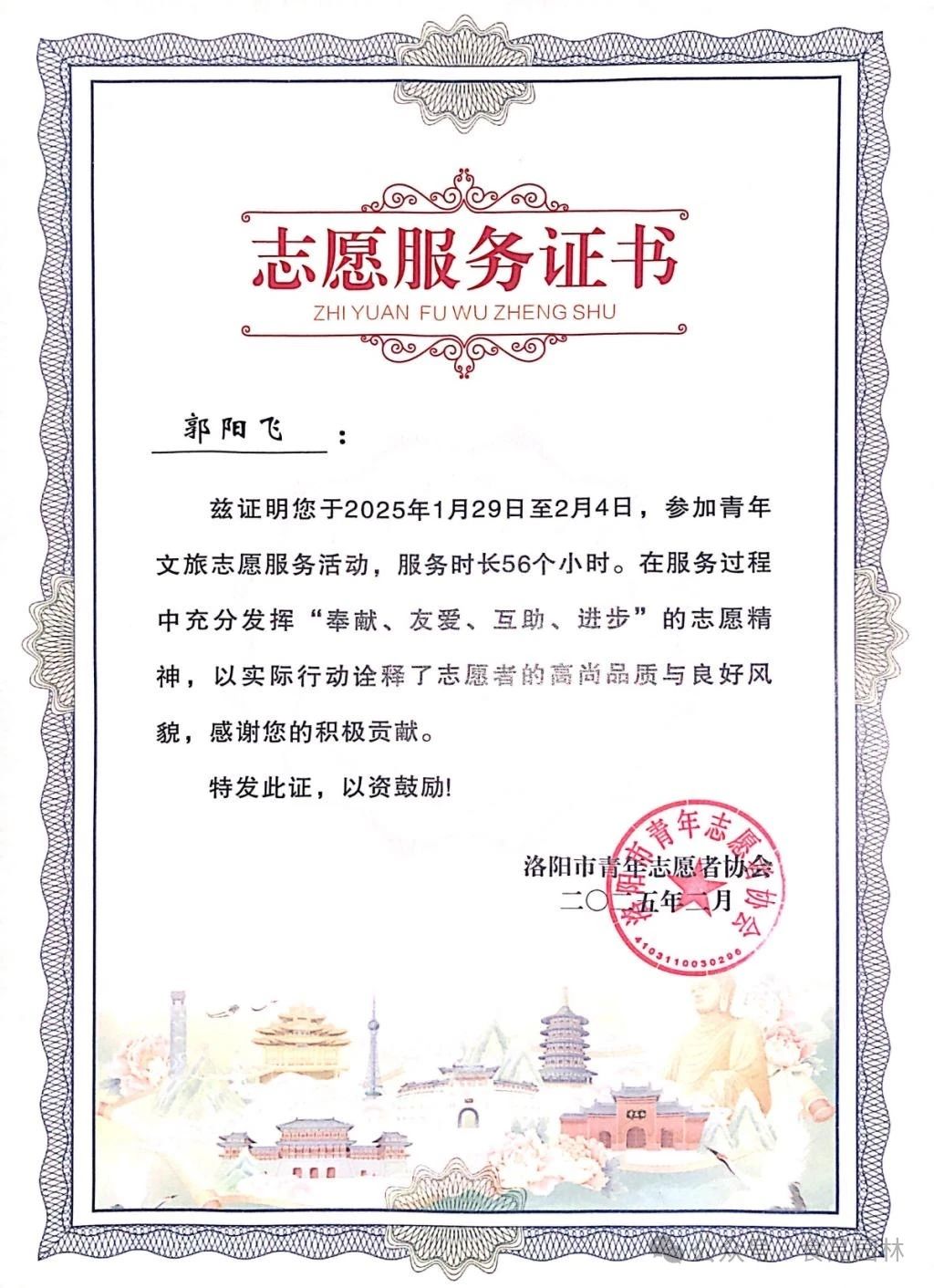 今年寒假,我以"洛小青"志愿者的身份扎根龙门古街与石窟景区,在零度的寒风里传递着洛阳城的温度。在龙门石窟入口,我是游客的“活地图”,凭借提前烂熟于心的路线图和景区开放时间,为初来乍到的游客规划最佳游览路线。遇到外国友人,我用简单英语和手势交流,还学会日语问候,收获了很多感谢。在龙门古街,我担当起文化传播者,为游客讲述“龙门山色”的故事,分享洛阳作为“东方博物馆之都”的独特魅力。这段志愿服务经历,给我带来了许多成长。我的沟通能力大幅提升,还重新认识了家乡文化,更收获了许多温暖瞬间。我深知,每一次指路、每一个微笑,都传递着洛阳的温度。在寒风中站岗虽辛苦,但看到游客满意的笑容,一切都值了。未来,我希望带动更多同龄人加入,让“青春志愿红”扮靓洛阳。