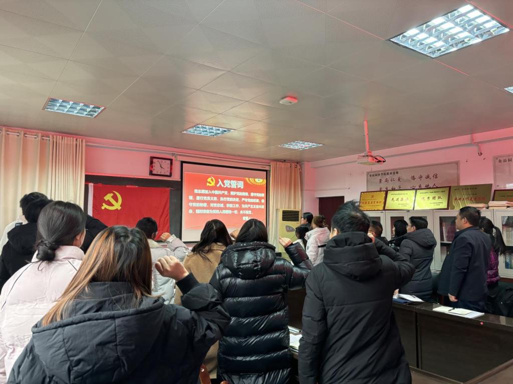 会议第五项:全体党员列队面向党旗,由组织委员张宁同志带领全体党员重温入党誓词。