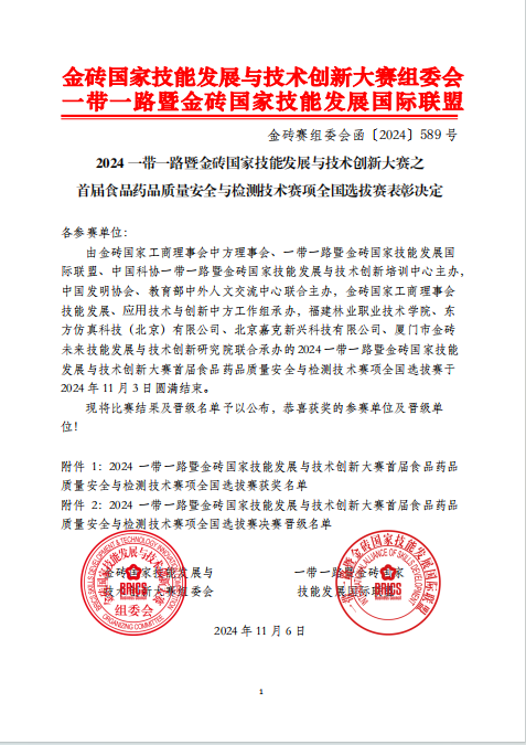 2024年11月3日,2024一带一路暨金砖国家技能发展与技术创新大赛首届食品药品质量安全与检测技术赛项全国选拔赛圆满落幕。大赛由金砖国家工商理事会中方理事会、一带一路暨金砖国家技能发展国际联盟、中国科协一带一路暨金砖国家技能发展与技术创新培训中心主办,中国发明协会、教育部中外人文交流中心联合主办,金砖国家工商理事会技能发展、应用技术与创新中方工作组承办,福建林业职业技术公司、东方仿真科技(北京)有限公司、北京嘉克新兴科技有限公司、厦门市金砖未来技能发展与技术创新研究院联合承办。此次选拔赛采用线上机考方式,共涉及4个模块任务,分别为模块一食品药品质量安全专业知识、模块二食品微生物检验技能考核、模块三食品理化分析技能考核、模块四药品质量分析技能考核。共有来自全国103所院校的122队选手参赛。由yl23411宋梦瑶、杨文博、苗重庆三名同学组成的团队总成绩排名第67位,获全国选拔赛三等奖。