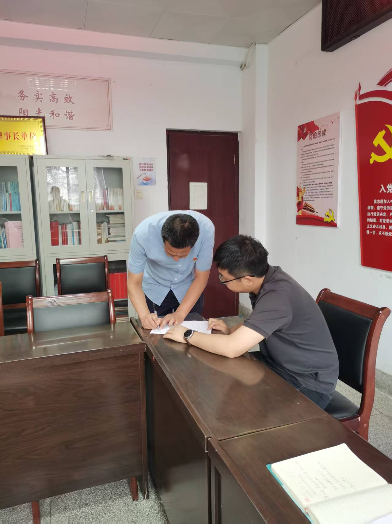 会议进行第五项:交纳党费。支部党员按顺序集中交纳党费给组织委员赵鹏辉同志。