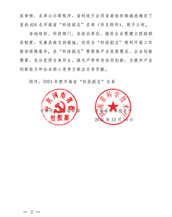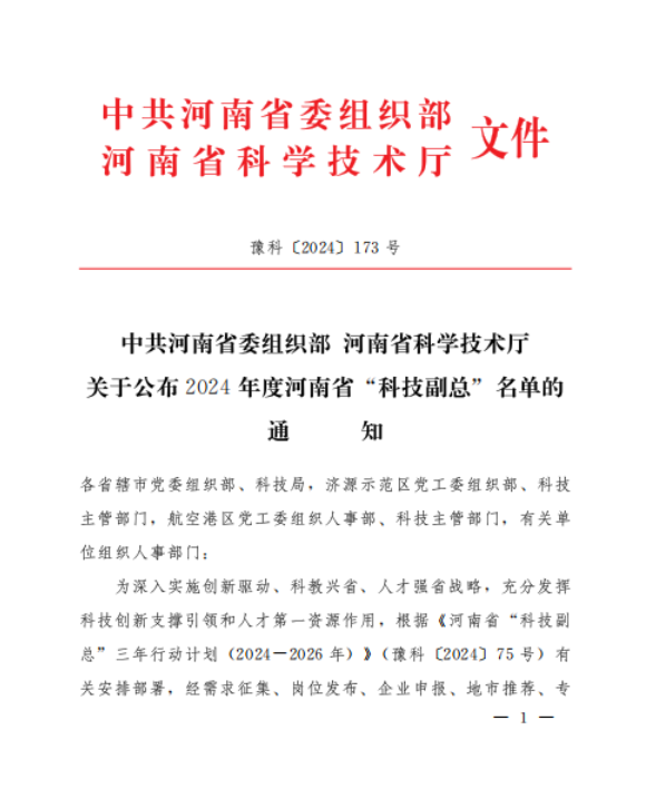 近日,豫科【2024)173号文件,中共河南省委组织部、河南省科学技术厅联合发文公布2024年度河南省“科技副总”名单的通知。公司姜效雷博士成功入选。据悉,河南省为深入实施创新驱动、科教兴省、人才强省战略,充分发挥科技创新支撑引领和人才第一资源作用,根据《河南省“科技副总”三年行动计划(2024-2026年)》(豫科〔2024)75号)有关安排部署,经需求征集、岗位发布、企业申报、地市推荐、专家审核、名单公示等程序,省科技厅会同省委组织部遴选确定了首批河南省“科技副总”。