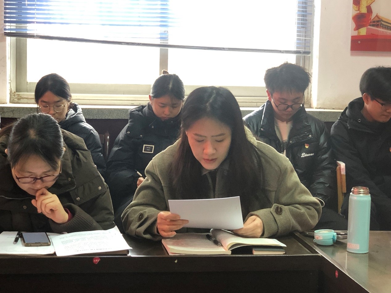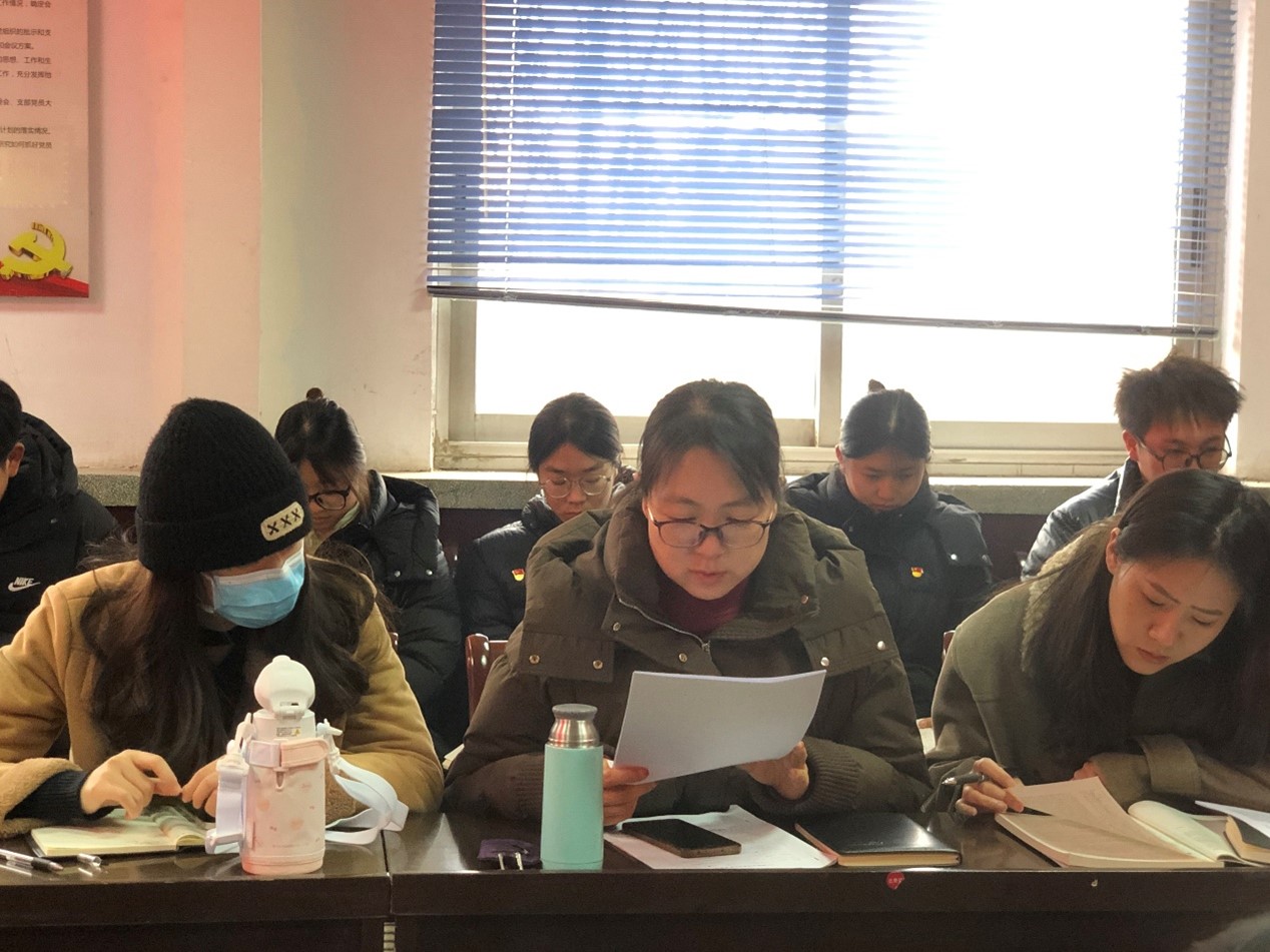 会议进行第一项:由党员石莹莹同志带领全体党员学习习近平论教育工作。