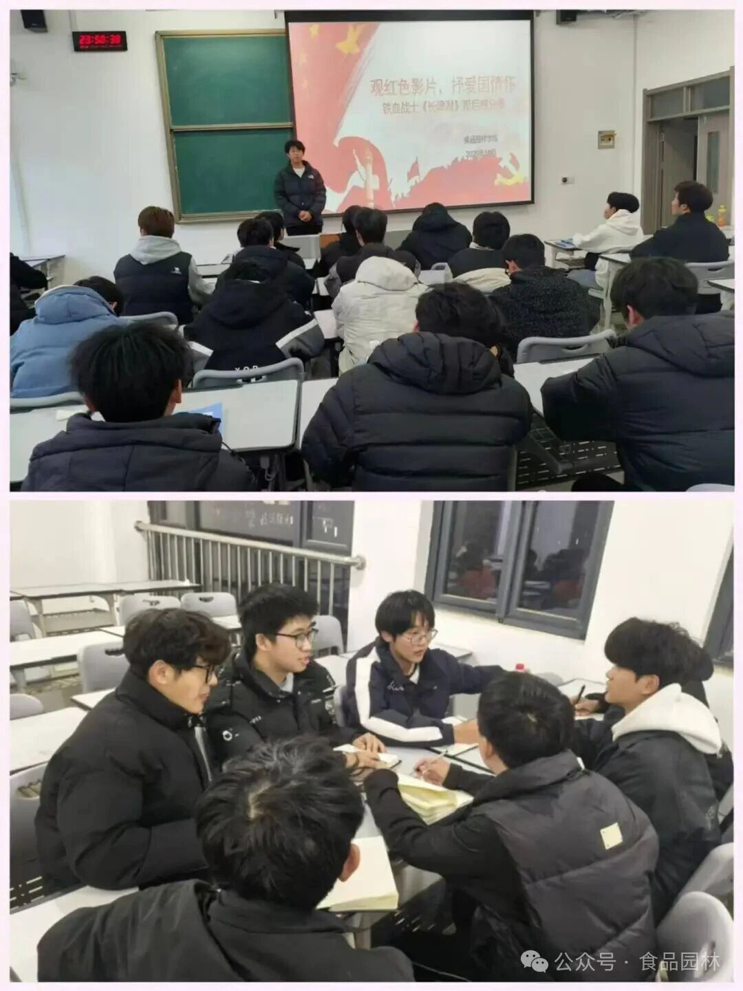 在随后的分享环节中,同学们主动登台,真诚交流观影体会。当提及“冰雕连”在严寒中依然保持战斗姿态的感人场景时,言语之间充满崇敬,台下同学无不为之动容,不少人悄然拭泪。分享结束后,大家意犹未尽,自发围坐成小组,展开热烈讨论。话题从对革命历史的敬畏,延伸到新时代青年的责任担当;从专业学习的现实意义,谈到如何将个人理想融入国家发展。真诚的交流促使思想在碰撞中升华,共同的感动让彼此的心灵更加贴近。红色基因在话语中传递,报国志向在共鸣中愈发坚定。