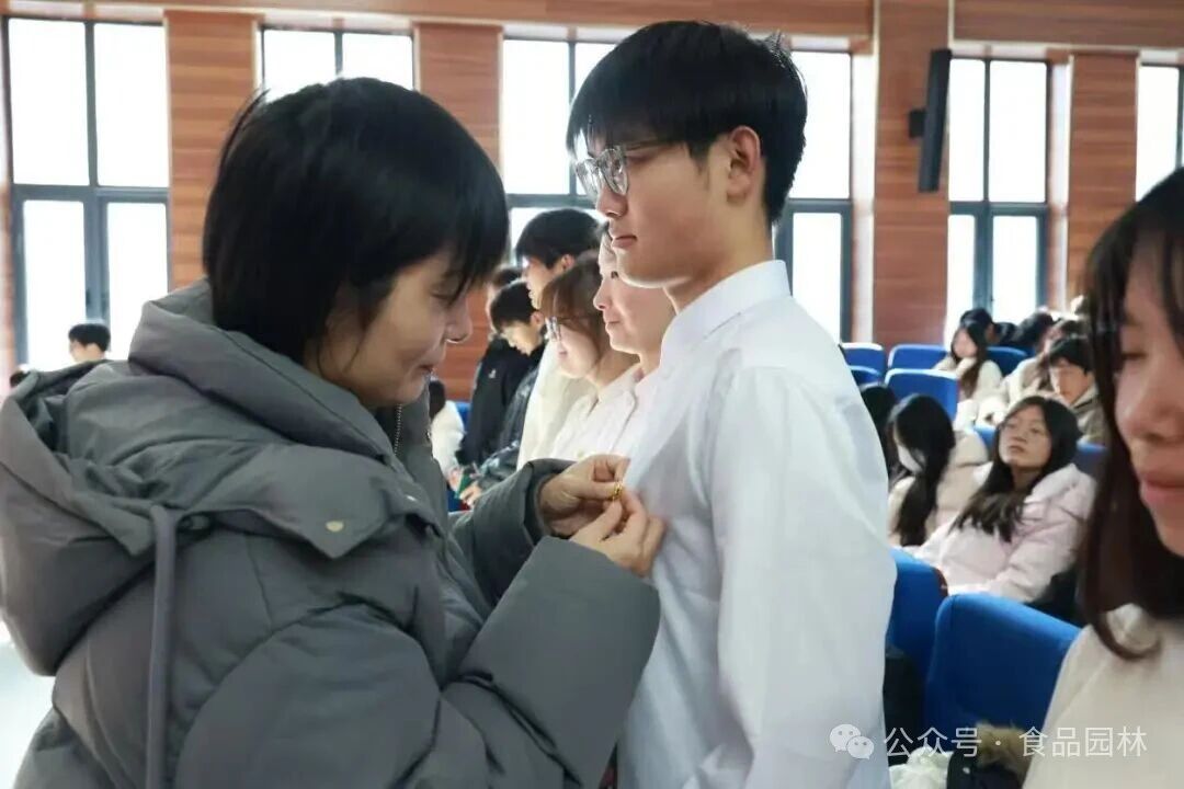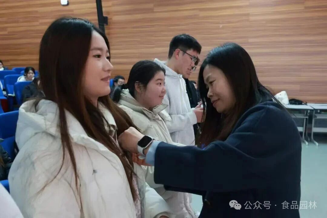 仪式在激昂的国歌声中拉开序幕,全场肃立,歌声嘹亮。团总支书记卫婕郑重宣读了2025年度新发展团员名单,每个被念到的名字都承载着组织的期许与信任。在庄重的氛围中,与会领导为新团员代表佩戴上闪亮的团徽,颁发团员证。团徽在胸前熠熠生辉,新团员们眼中闪烁着坚定与自豪。